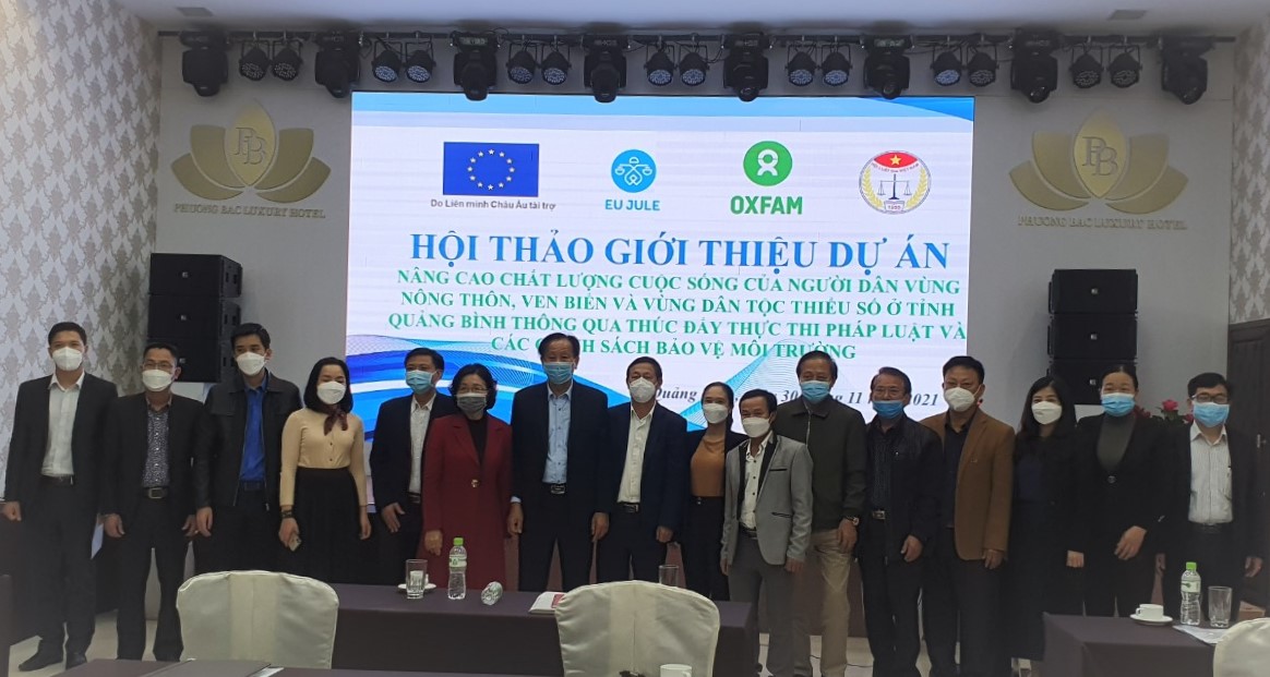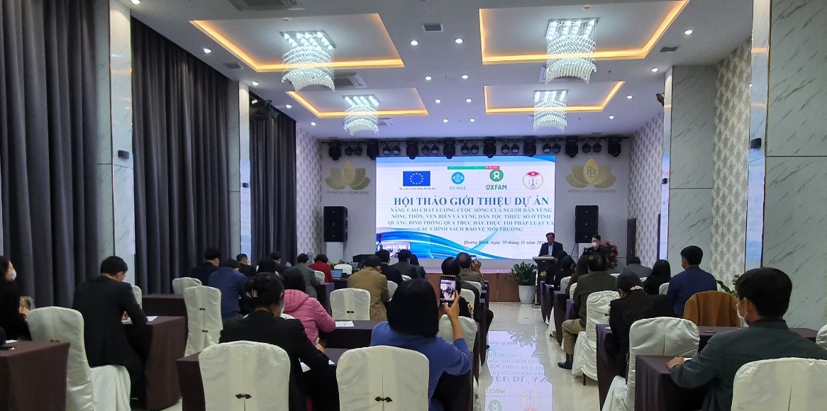 Ngày 30/11/2021, tại Hội trường Khách sạn phương bắc LUXURY hotel, Hội Luật gia tỉnh Quảng Bình phối hợp với Trung tâm Nghiên cứu Phát triển Kinh tế và Môi trường Bền vững tổ chức Hội thảo khởi động Dự án “Nâng cao chất lượng cuộc sống của người dân vùng nông thôn, ven biển và vùng dân tộc thiểu số ở tỉnh Quảng Bình thông qua thúc đẩy thực thi pháp luật và các chính sách bảo vệ môi trường” do Liên minh Châu Âu EU tài trợ thông qua Quỹ Thúc đẩy sáng kiến Tư pháp (JIFF) trên địa bàn tỉnh Quảng Bình Trực tiếp tham dự tại Hội thảo có trên 60 đại biểu là đại diện lãnh đạo các sở, ban, ngành, đoàn thể cấp tỉnh; đại diện lãnh đạo UBND, Ủy ban MTTQVN và đại diện các cơ quan, đơn vị liên quan huyện Bố Trạch, Quảng Ninh, thành phố Đồng Hới; đại diện Lãnh đạo UBND, Ủy ban MTTQVN và một số cán bộ của tám xã, phường ở ba đơn vị cấp huyện…; cùng dự thông qua hệ thống phần mềm trực tuyến Zoom có diện Ban Quản lý cấp cao Quỹ JIFF - Tổ chức Oxfam tại Việt Nam, Ban Quản lý Dự án EU JULE - Bộ Tư pháp và đại diện và các tổ chức, đơn vị được tài trợ lần thứ ba thuộc hợp phần JIFF