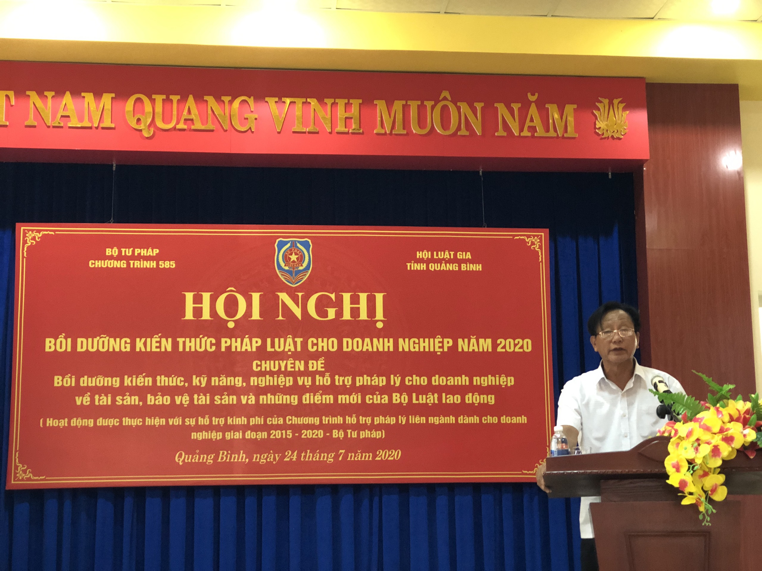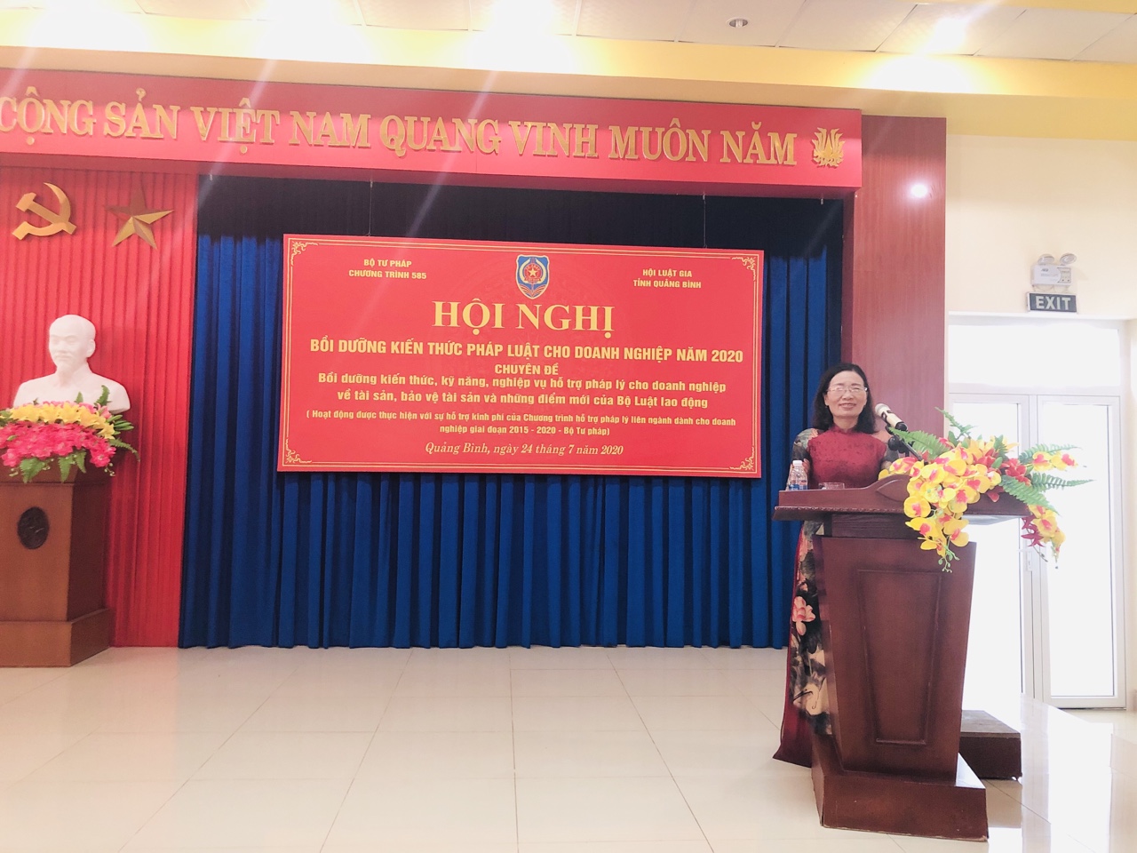 Được sự đồng ý và hỗ trợ của Ban Quản lý Chương trình hỗ trợ pháp lý liên ngành dành cho doanh nghiệp giai đoạn 2015-2020 (Chương trình 585) - Bộ Tư pháp, ngày 24/7/2020, tại hội trường Trung tâm Dịch vụ việc làm Thanh niên tỉnh Quảng Bình, Hội Luật gia tỉnh Quảng Bình tổ chức Hội nghị bồi dưỡng kiến thức, kỹ năng, nghiệp vụ hỗ trợ pháp lý cho doanh nghiệp về quyền tài sản, bảo vệ quyền tài sản và những điểm mới của Bộ luật Lao động. Dự Hội nghị có gần 100 đại biểu là cán bộ, hội viên tại các cấp Hội Luật gia trong tỉnh, các tư vấn viên pháp luật tại các Trung tâm Tư vấn pháp luật và cán bộ thực hiện công tác hỗ trợ pháp lý tại các cơ quan, tổ chức thực hiện chức năng hỗ trợ pháp lý cho doanh nghiệp; cán bộ thực hiện công tác hỗ trợ pháp lý tại các doanh nghiệp; tư vấn pháp luật của doanh nghiệp trên địa bàn tỉnh.