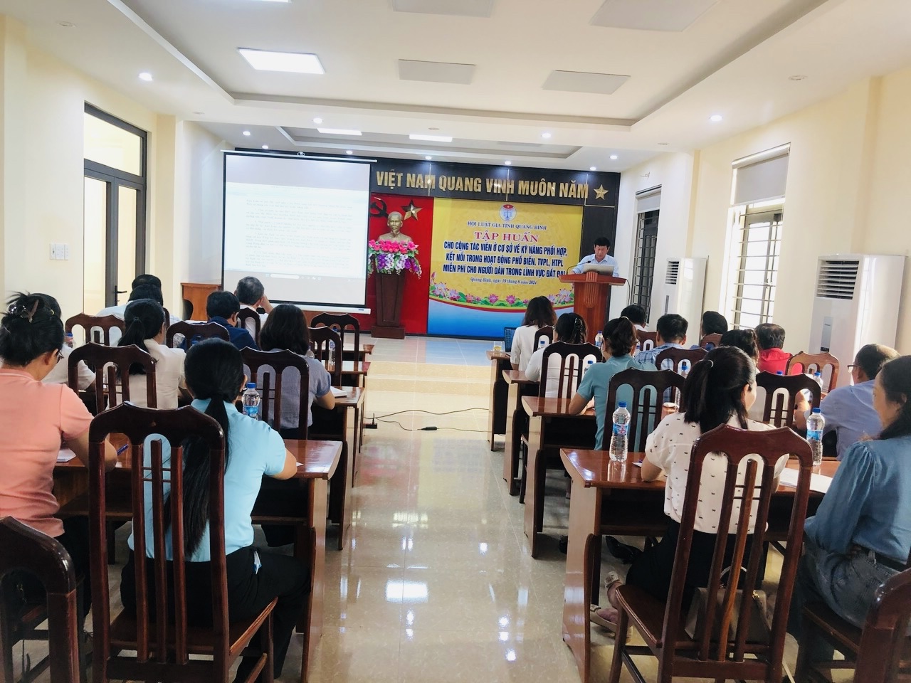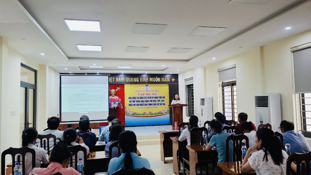 Trong khuôn khổ Dự án nêu trên; đồng thời để tăng cường sự phối hợp, kết nối thực hiện Dự án và được sự đồng ý của UBND tỉnh tại Công văn số 1469/UBND-NCVX ngày 09/8/2024 về việc Hội Luật gia tỉnh tổ chức các hội nghị, hội thảo quốc tế theo Quyết định số 06/2020/QĐ-TTg ngày 21/02/2020 của Thủ tướng Chính phủ, trong 02 ngày 19/8 và 23/8 /2024 Trung tâm tư vấn pháp luật thuộc Hội Luật gia tỉnh đã tổ chức 02 cuộc tập huấn về kỹ năng phối hợp, kết nối trong hoạt động phổ biến, TVPL, HTPL miễn phí cho người dân trong lĩnh vực đất đai cho 47 đại biểu, trong đó có 43 cộng tác viên là Trưởng thôn, Tổ trưởng Tổ dân phố, đại diện UBMT, Hội Liên hiệp Phụ nữ và Hội Nông dân cấp xã… trên địa bàn một số xã, phường, thị trấn của huyện Bố Trạch và Thành phố Đồng Hới.